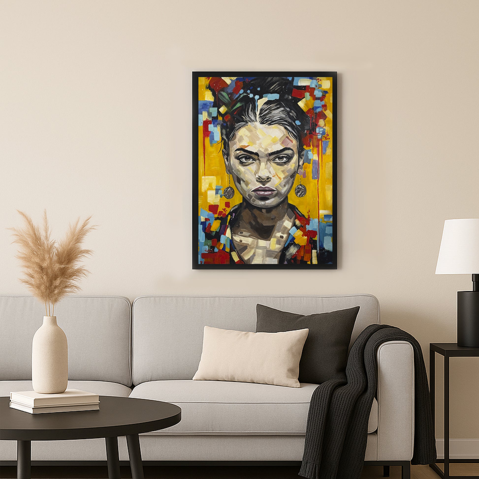 Entre éclats de jaune et touches géométriques, un visage se dresse — à la fois symbole et mystère. Cette œuvre revisite la figure iconique avec une énergie contemporaine, mêlant force intérieure et poésie chromatique.