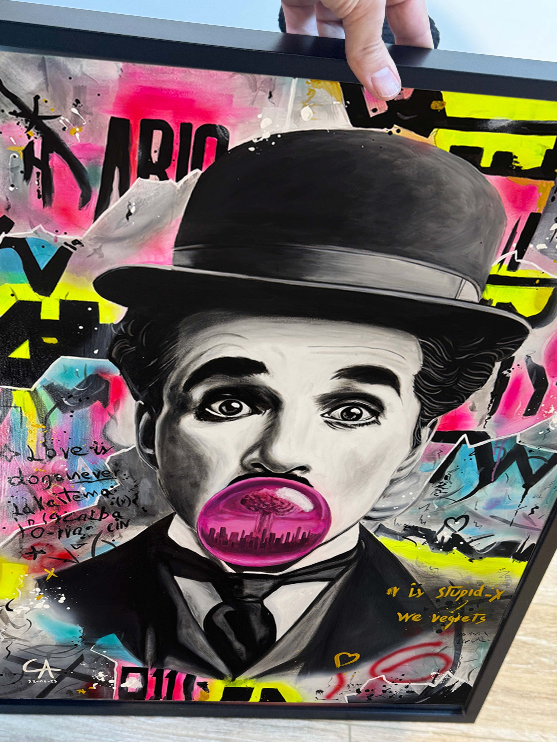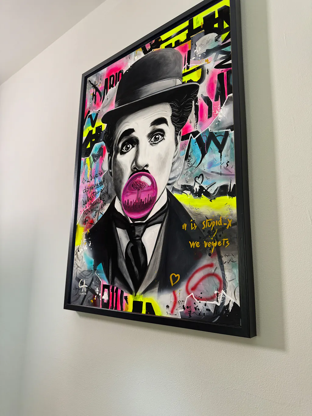 L’icône du cinéma muet se réinvente dans un univers pop et décalé. Entre humour et mélancolie, l’œuvre explore la frontière fragile entre l’art classique et la liberté urbaine. Un hommage vibrant à la légèreté du génie.